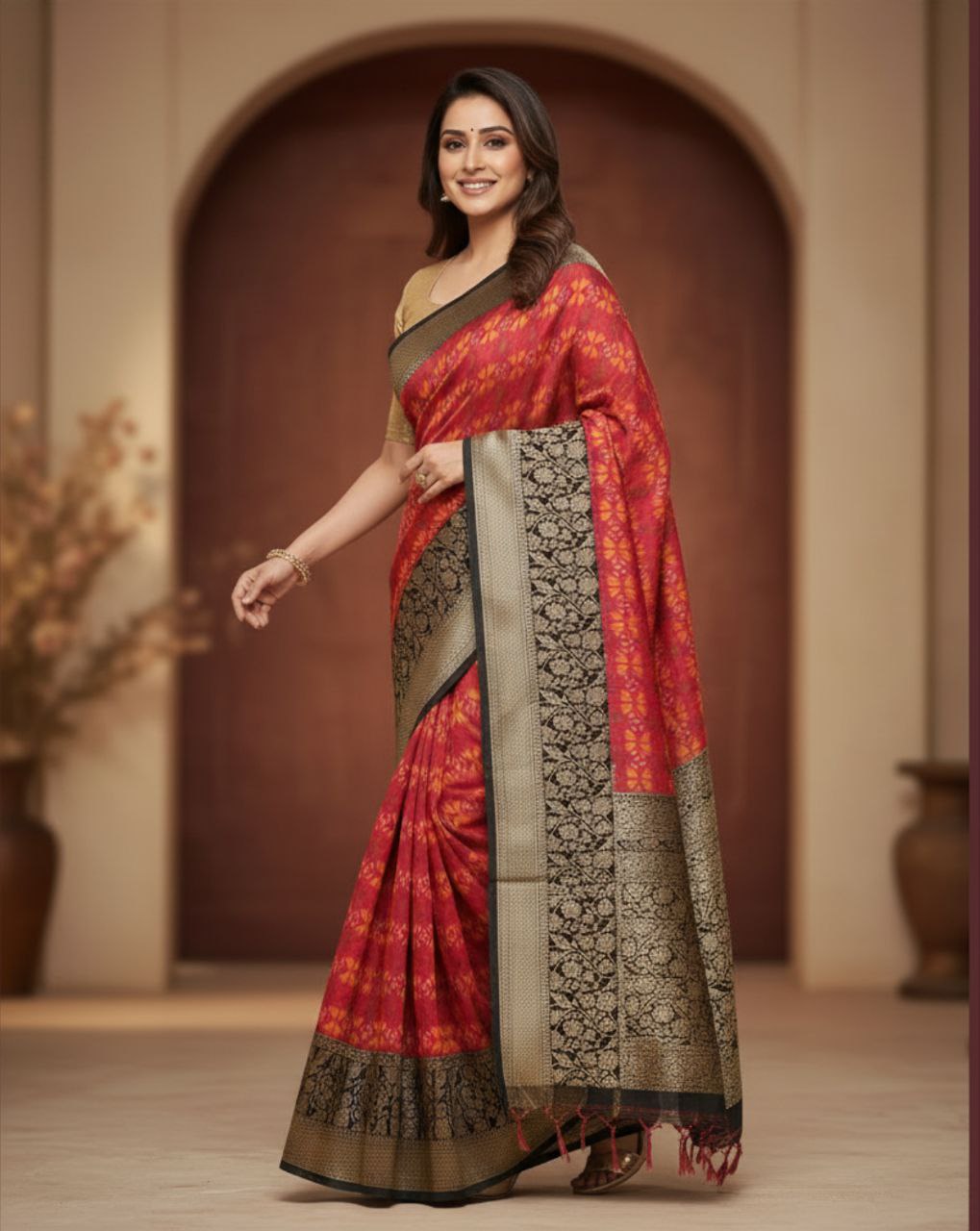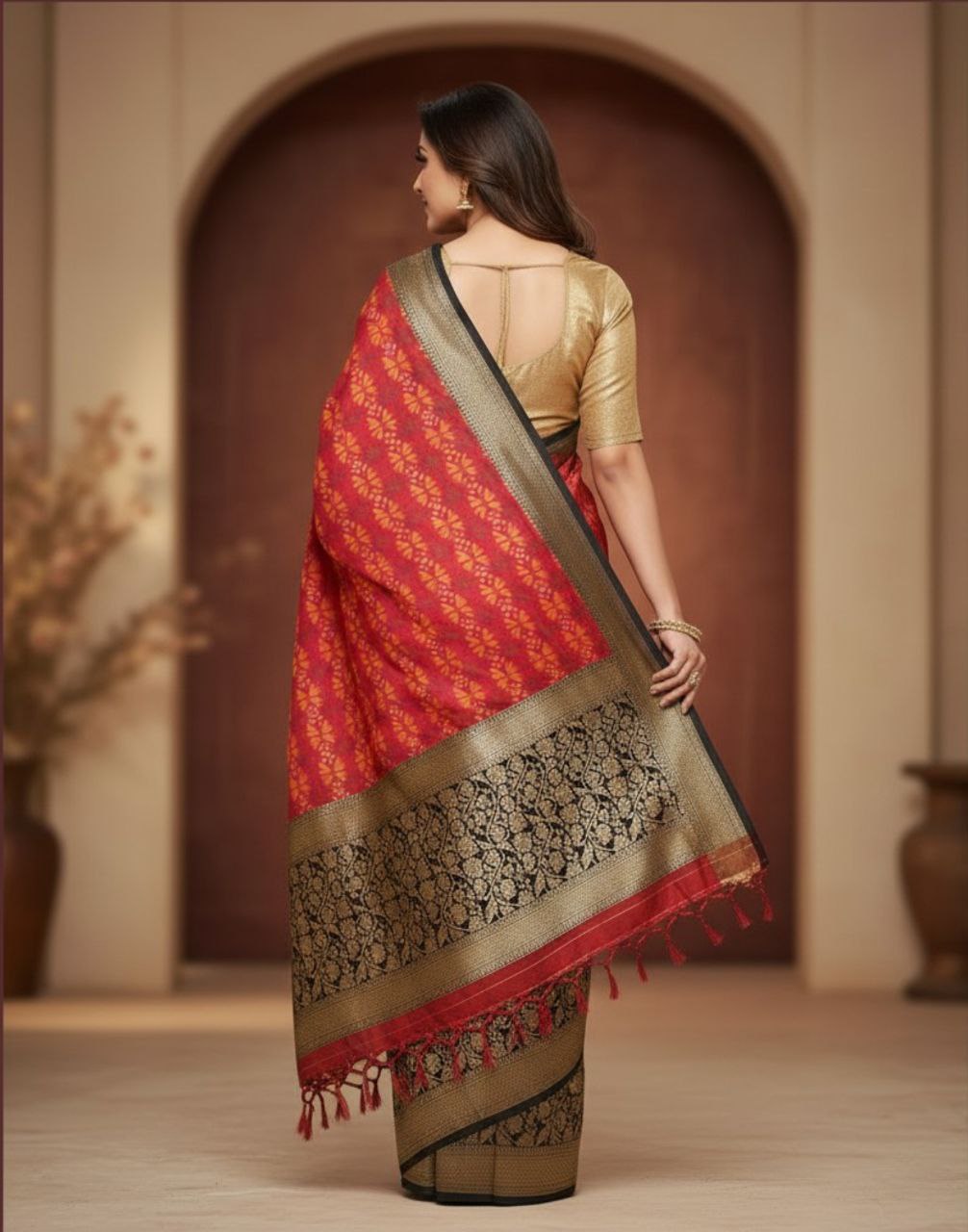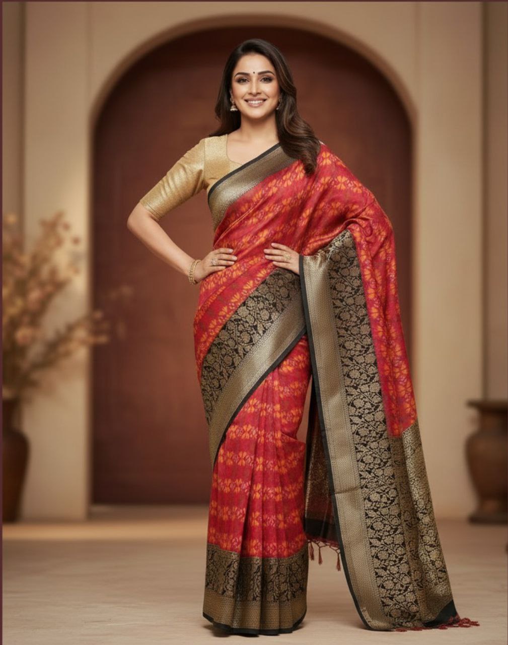 Embrace the warmth of traditional artistry with this exquisite Ochre and Crimson Banarasi Fusion Saree. This piece is a masterful blend of vibrant hues and classic weaving techniques, designed for the modern woman who cherishes her heritage. The body of the saree features a unique, sun-kissed ochre and orange-red marbled effect, creating a dynamic visual texture that glows under any light. This fiery palette is elegantly grounded by a striking black and gold Zari border, which showcases intricate floral and vine patterns characteristic of authentic Banarasi craftsmanship.