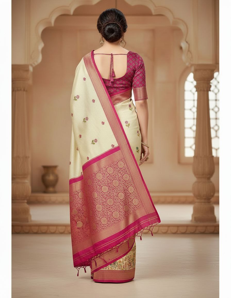 Step into the spotlight with this stunning creation from Swanari Fashion, where traditional craftsmanship meets regal elegance. This saree features a serene cream-colored base crafted from luxurious silk blend fabric, offering a soft drape and a subtle, sophisticated sheen. The body is delicately scattered with vibrant floral woven buttis that provide a touch of playful color.