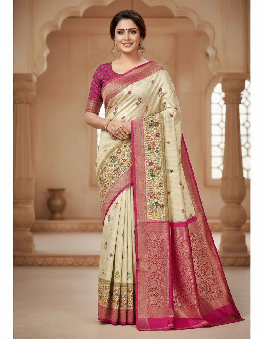 The true highlight of this ensemble is the exquisite Rani Pink border and pallu. It showcases a magnificent blend of Kalamkari-inspired storytelling prints and rich, intricate golden Zari work. The bold pink hue creates a striking contrast against the neutral cream, making it a perfect statement piece for high-profile events. Accompanied by a matching Rani Pink blouse with delicate patterns, this saree is designed for the woman who appreciates the fine details of Indian heritage. Whether you are attending a wedding, a festive celebration, or a formal gathering, this saree ensures a look of timeless grace and unmatched poise.