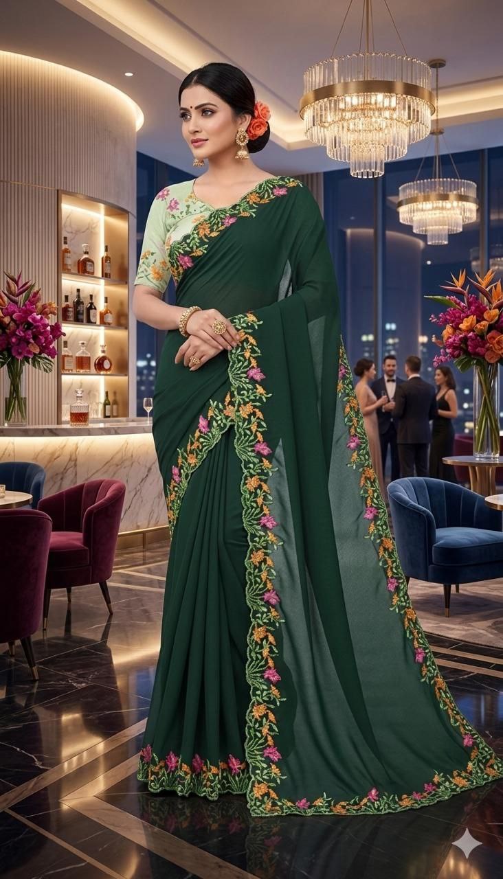 Exude an aura of regal charm with the Swanari Fashion Emerald Forest Saree, a stunning piece designed for those who love to blend nature-inspired aesthetics with high-end glamour. This deep forest green saree is crafted from premium, lightweight georgette that offers a fluid, flattering silhouette, perfect for gliding through any upscale event. The highlight of this ensemble is the scalloped vine border, intricately embroidered with a vibrant palette of sunset orange and magenta florals, creating a striking contrast that catches every light.