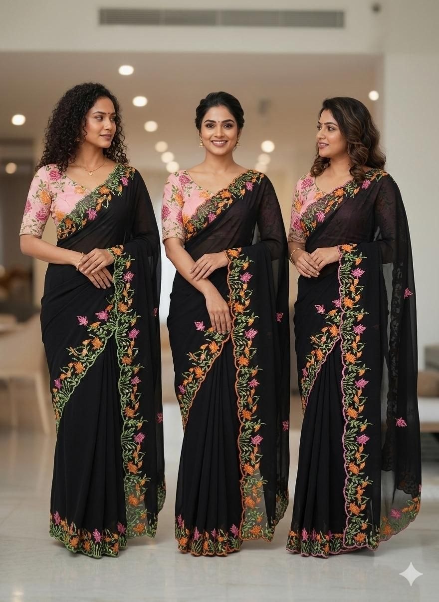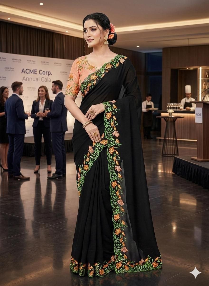 Step into a world of timeless elegance with the Swanari Fashion Midnight Bloom Saree. This exquisite ensemble is a masterclass in contrast, featuring a deep, obsidian-black georgette drape that flows with ethereal grace. The saree is brought to life by a meticulously crafted floral border, where vibrant shades of coral, amber, and moss green intertwine in a delicate vine pattern, offering a refreshing pop of color against the dark canvas.