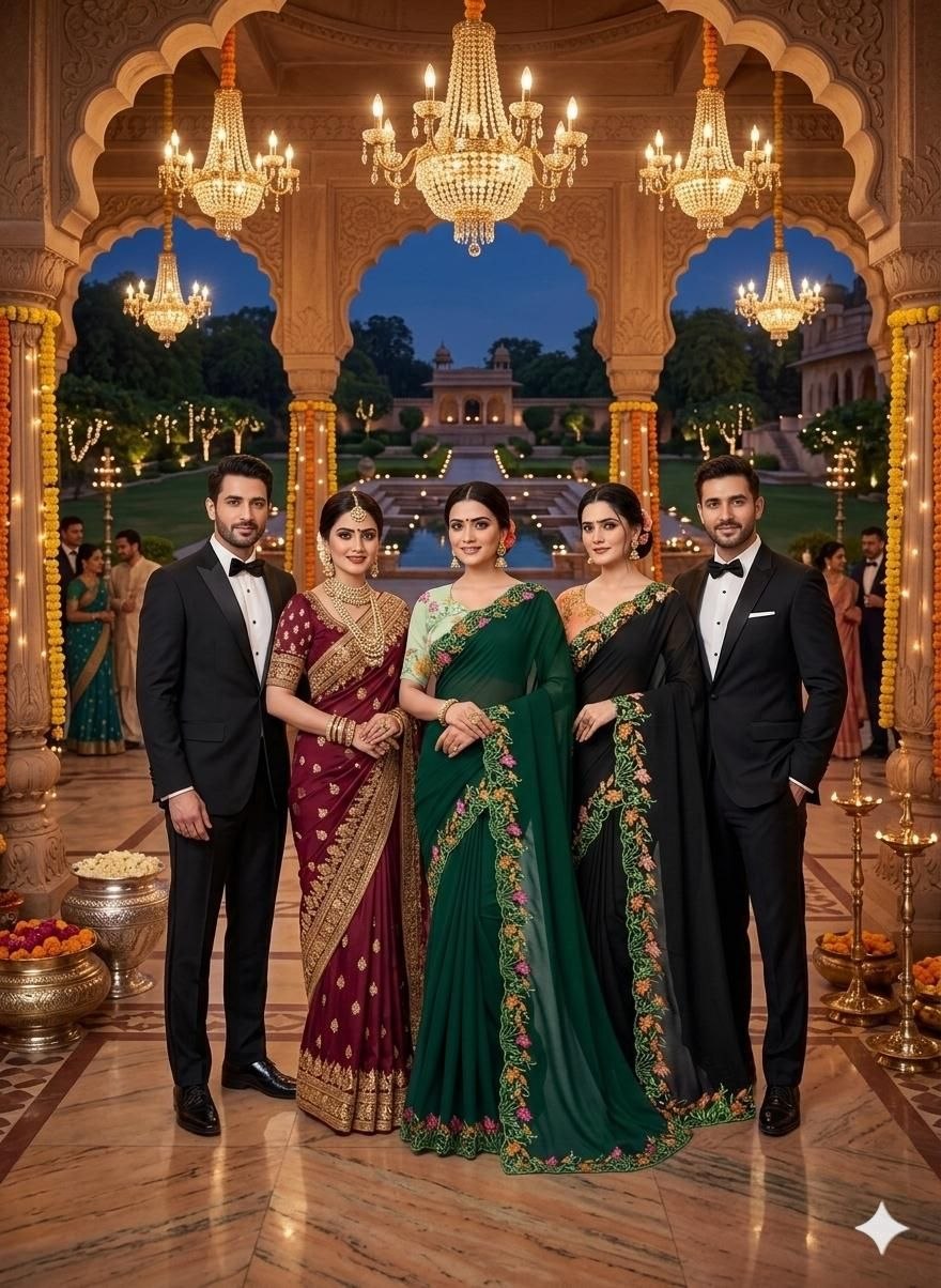 Paired with a striking blush-pink floral blouse, the outfit balances traditional charm with contemporary flair. The intricate embroidery on the saree’s edge mirrors the romantic aesthetics of a blooming garden at twilight. Designed for the modern woman who values both comfort and sophistication, the lightweight fabric ensures you remain the center of attention from the first toast to the final dance. Whether it’s a high-profile wedding or an intimate evening gala, this saree is your go-to for making an unforgettable statement.