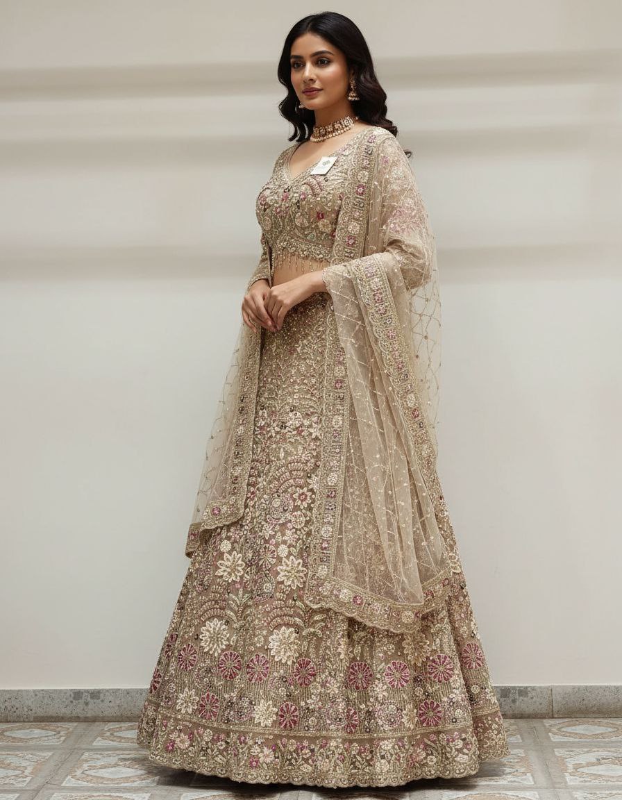 | Lehenga | Fabric: Art Silk or Raw Silk. Color: Dusty Teal, Blue-Green, or Smoke Blue. Design: Full-flared skirt with a subtle textured or crushed finish, offering an elegant drape. Minimal embellishment on the skirt itself. |