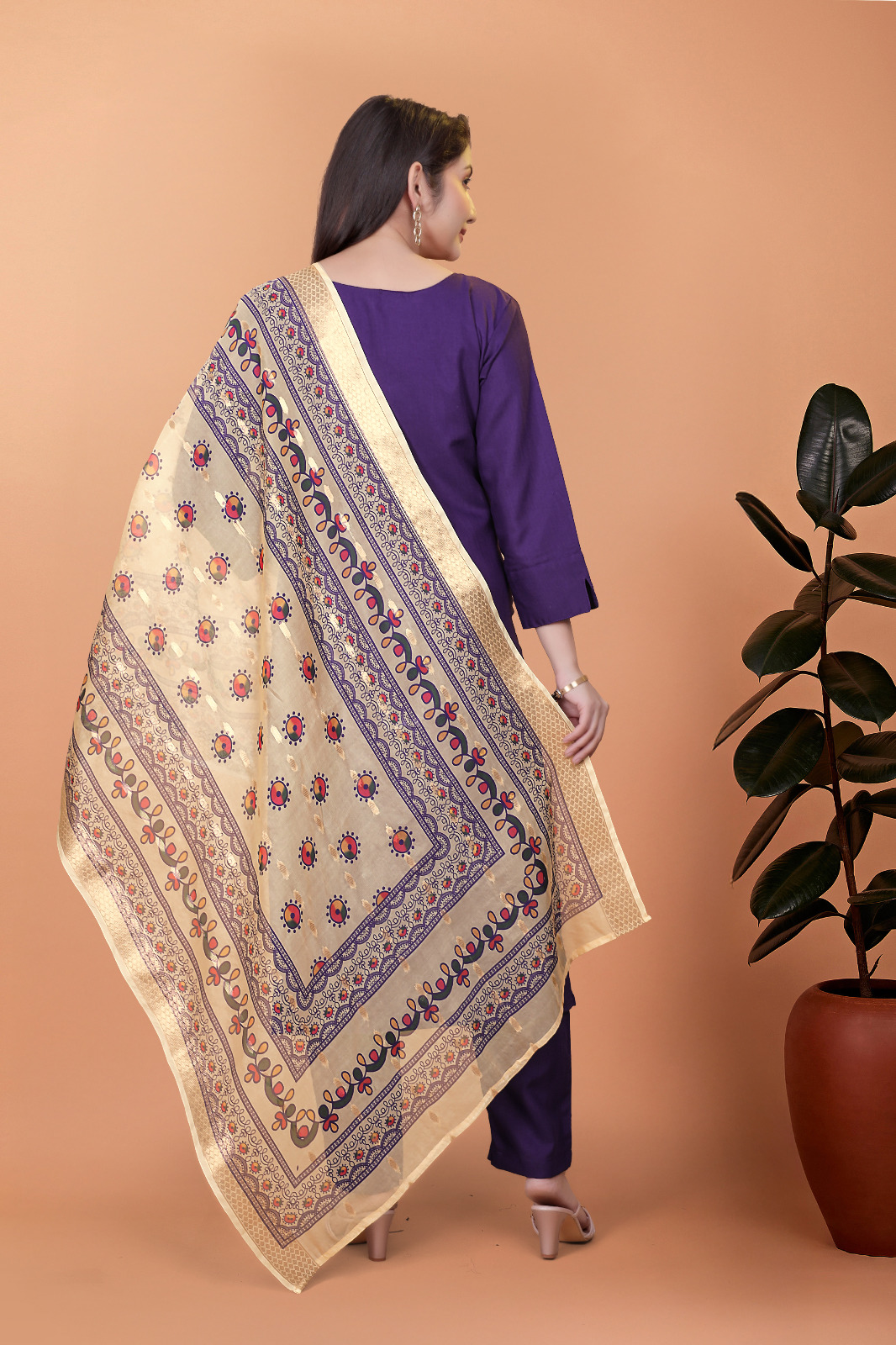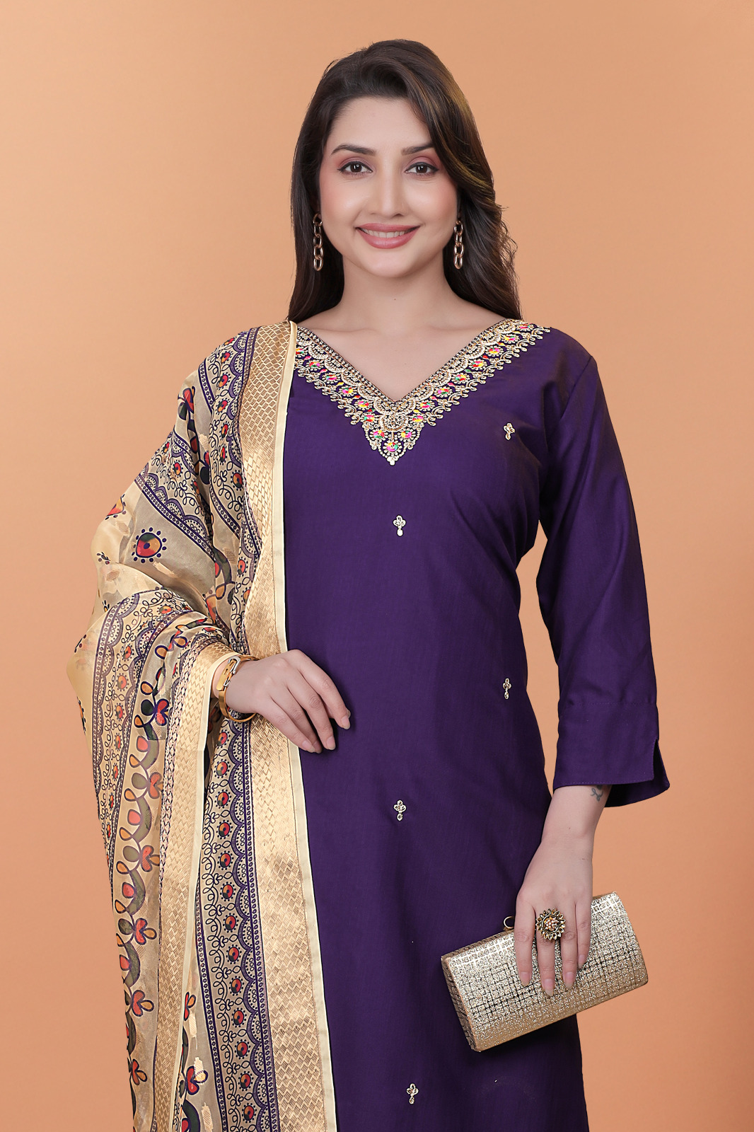 Make a sophisticated statement in our striking Royal Purple Kurta Set. The straight-cut Kurta features a rich, solid hue and is elegantly highlighted by detailed multi-hued embroidery framing the V-neckline, complemented by delicate scattered motifs on the body. The true centerpiece is the vibrant Dupatta, showcasing intricate Kalamkari or Patola-style printing on a cream base, edged with a dazzling gold woven border. Perfect for semi-formal evening events or festive day celebrations, this set promises an effortlessly regal look.