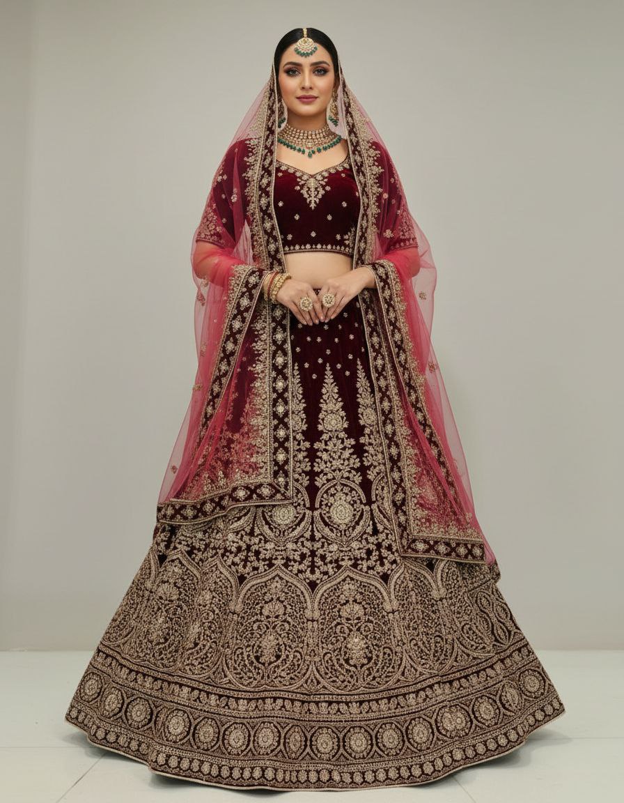 | Lehenga | Fabric: Luxurious Velvet. Color: Deep Maroon, Wine Red, or Burgundy. Design: Full-flared A-line skirt, completely covered in dense Gold Zari, Sequin, and Bead Work. The embroidery features large Vertical Floral/Booti Motifs and a very heavy, ornate border along the hem. |