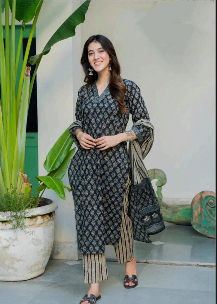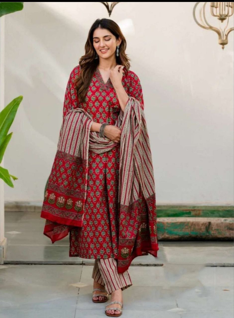 Embrace the artistry of traditional textiles with this vibrant red three-piece cotton ensemble. The set features a straight-cut kurta adorned with a dense all-over block print in green and beige, creating a rich, festive texture against the bold red base. The kurta has a flattering V-neckline and three-quarter sleeves. It is paired with matching pants featuring a sophisticated vertical stripe pattern that complements the kurta’s print perfectly. The outfit is completed by a coordinating dupatta which beautifully combines the main block print elements with the bold vertical stripes and a decorative floral border on the ends. Crafted from comfortable cotton, this set offers a blend of style and breathability, making it an excellent choice for daytime events, family functions, or festive gatherings where you want an effortlessly authentic and colorful look.