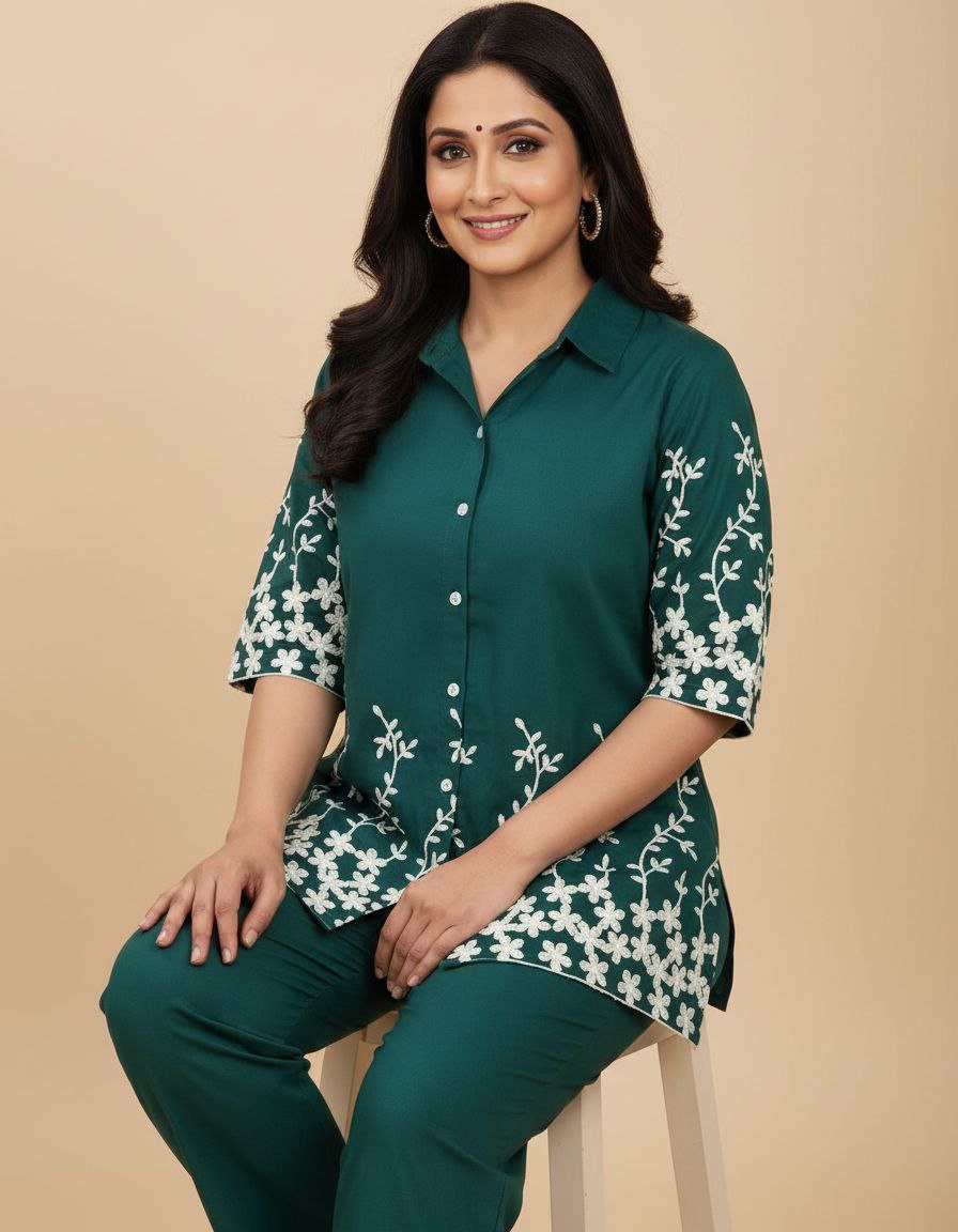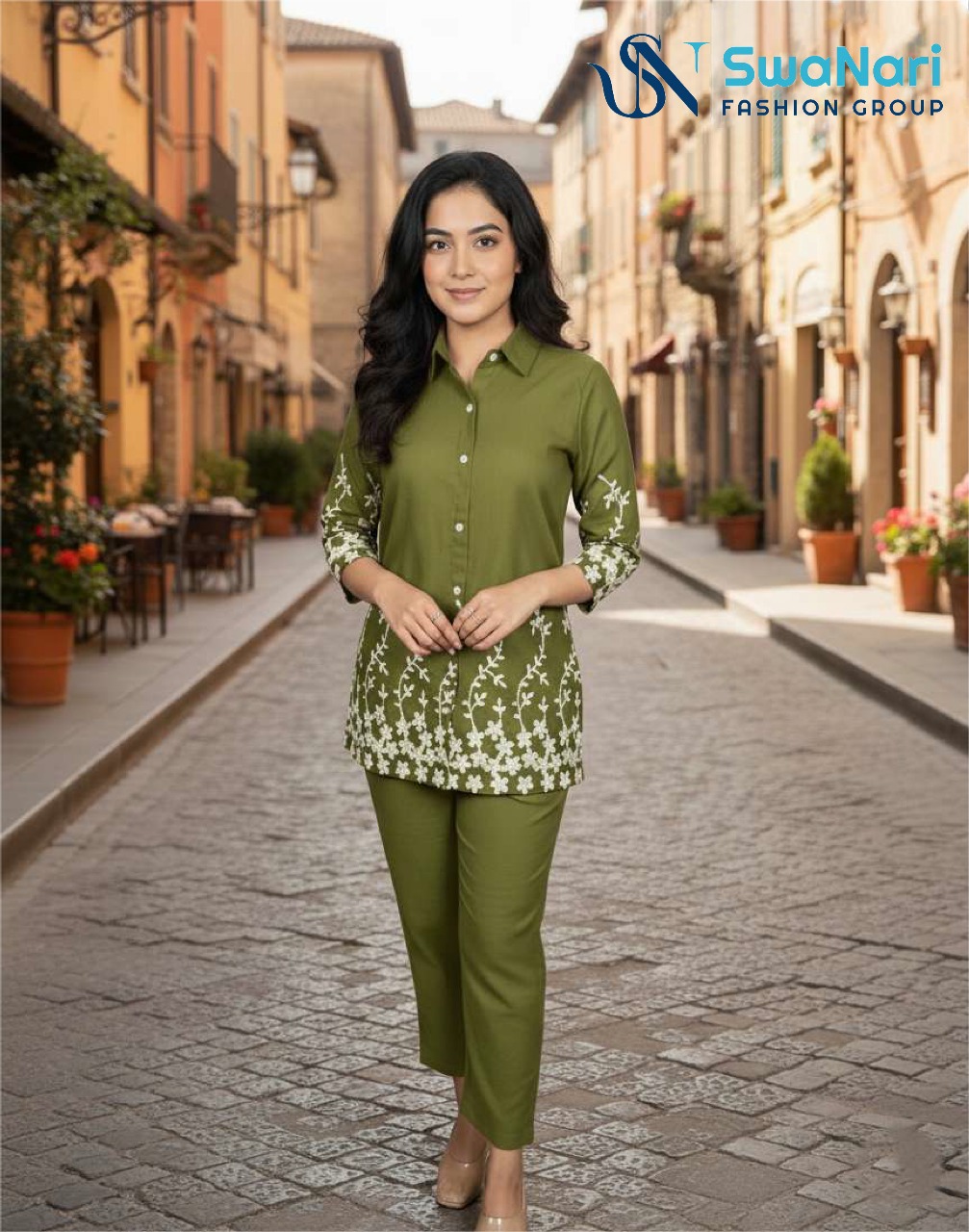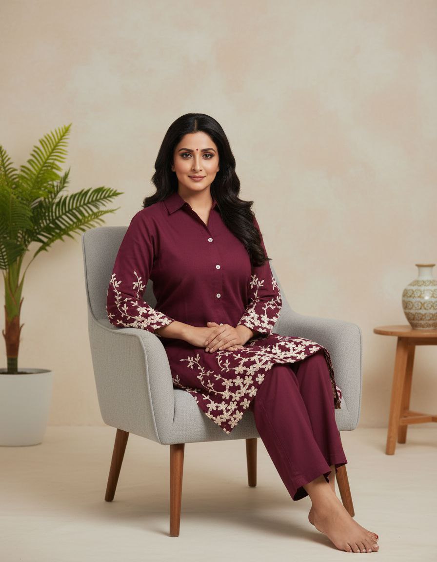 Elevate your casual and semi-formal wardrobe with this sophisticated Wine Embroidered Tunic and Trouser Set from the SwaNari Fashion Group. This contemporary ensemble features a rich, solid wine-colored fabric in a comfortable, structured material, perfect for a polished look. The tunic is designed with a classic Shirt Collar and a full front button placket, offering a modern, westernized silhouette. Its standout feature is the exquisite White Floral Embroidery along the hemline and cuffs, adding a touch of traditional elegance. The tunic is styled with adjustable 3/4 Sleeves and is kept at a shorter length, resembling a contemporary top or short kurta. The set is completed by tailored, straight-fit trousers in the same solid wine hue, ensuring a streamlined and monochromatic finish. Ideal for office wear, casual outings, or lunch dates, this set perfectly fuses comfort with contemporary ethnic fashion.