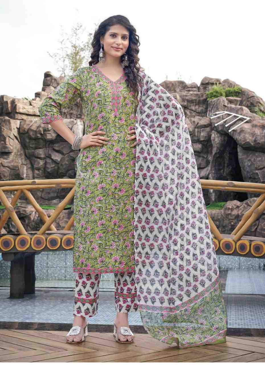 Women’s Olive Green & Pink Floral Cotton Kurta Set with Pant and Dupatta
