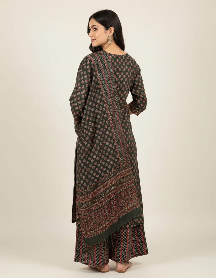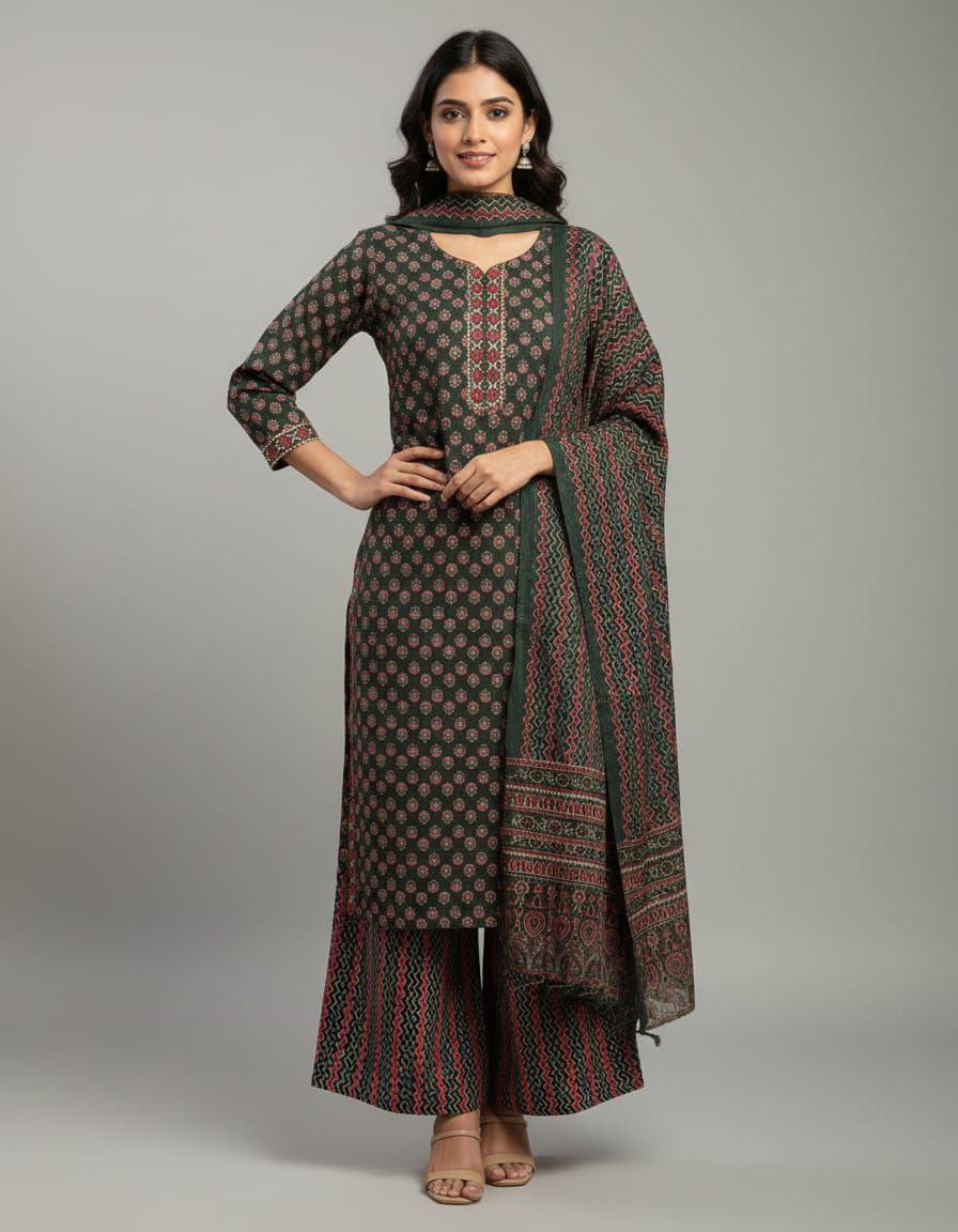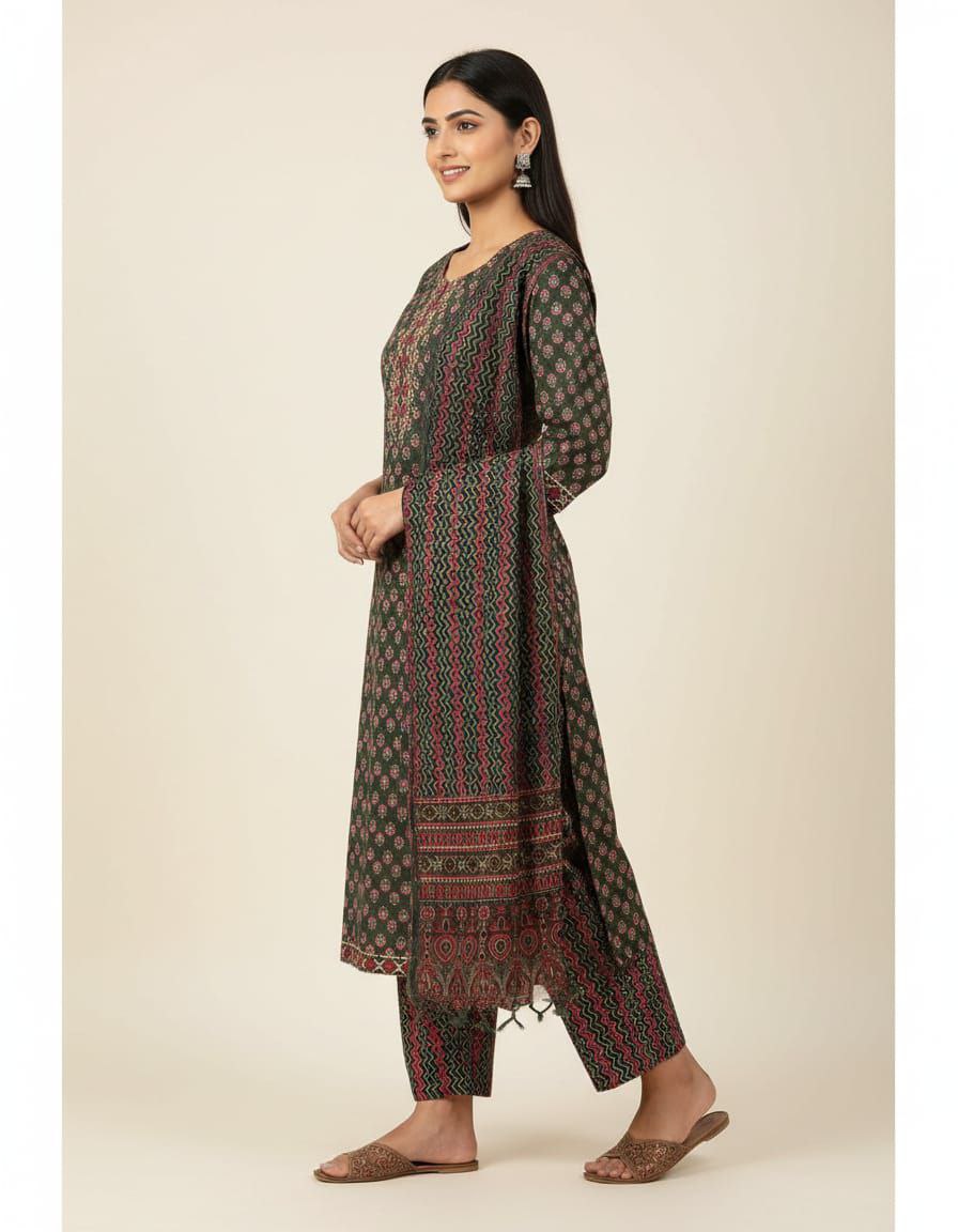 Elevate your ethnic wardrobe with this sophisticated 3-piece Kurta set, blending traditional charm with contemporary elegance. Crafted from a breathable, lightweight fabric, the straight-cut kurta features an intricate all-over floral and geometric print in earthy rust and sage green tones. The neckline is highlighted with a detailed yoke pattern and subtle piping for a refined finish. Accompanied by matching printed trousers and a sheer, flowing dupatta with a delicate border, this set offers a cohesive and graceful silhouette. Perfect for office wear, festive gatherings, or casual outings, it promises both comfort and effortless style.