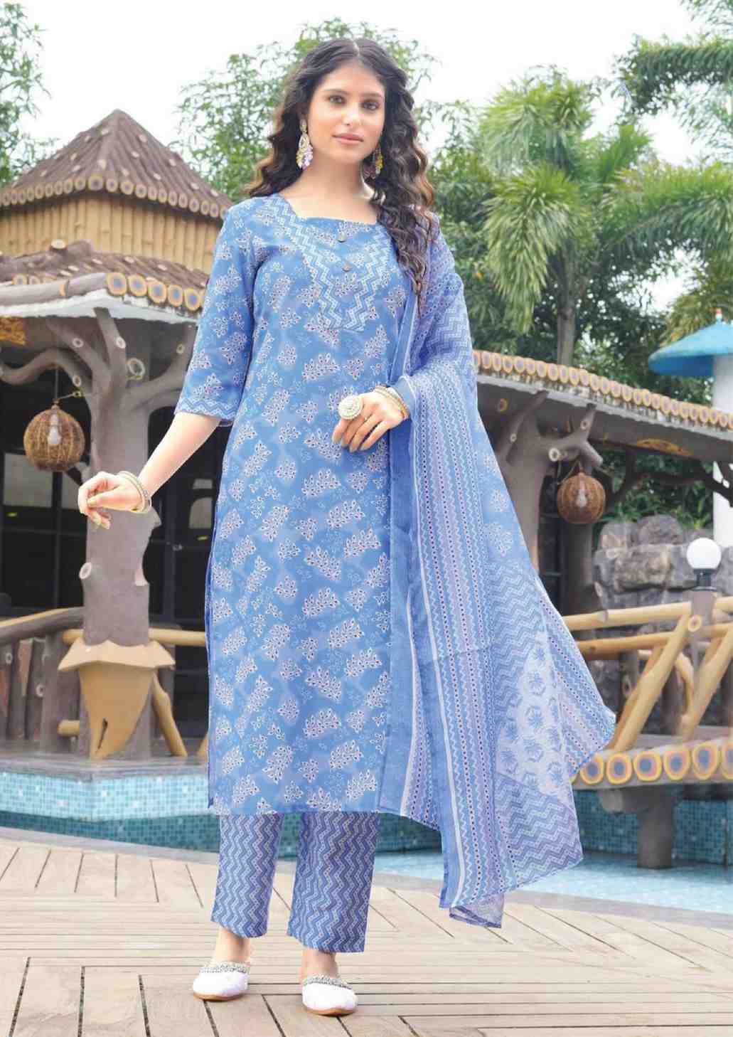 Elevate your daily ethnic wardrobe with this serene sky blue three-piece ensemble. The straight-cut kurta is crafted from lightweight fabric, featuring an all-over traditional block-style floral print and a stylishly detailed yoke with button accents. For a modern contrast, it is paired with straight-fit trousers sporting a dynamic chevron (zigzag) pattern. The look is beautifully pulled together by a matching dupatta that combines geometric borders with delicate floral motifs. This coordinated set offers a refreshing blend of comfort and elegance, making it an ideal choice for office hours, casual outings, or daytime social gatherings.