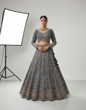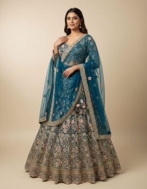 Step into the spotlight with this electrifying Aqua Blue Net Lehenga Choli. The bright, refreshing blue hue is perfect for Sangeet or festive occasions. The voluminous net skirt features delicate scattered silver sequins, giving it a beautiful, subtle shimmer. The sleeveless choli is the spectacular centerpiece, completely covered in dense, meticulous Silver Thread and Sequin…